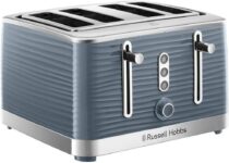 The Inspire 4 Slice Grey toaster features a sleek design with four large slots, perfect for preparing breakfast with family.