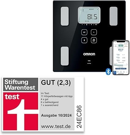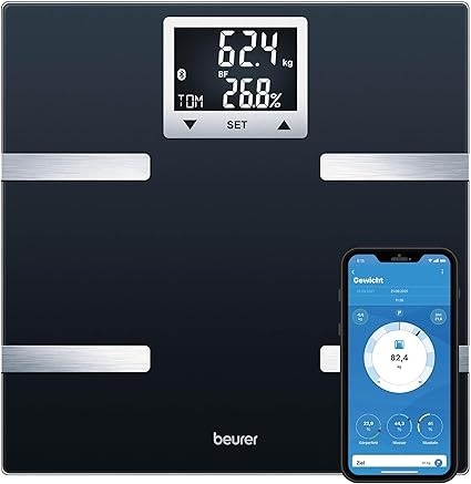 Funktionen & Messungen: Erfasst 13 Körpermetriken wie Gewicht, Körperfett, Muskelmasse, Wasser, Knochen, BMI und Grundumsatz.